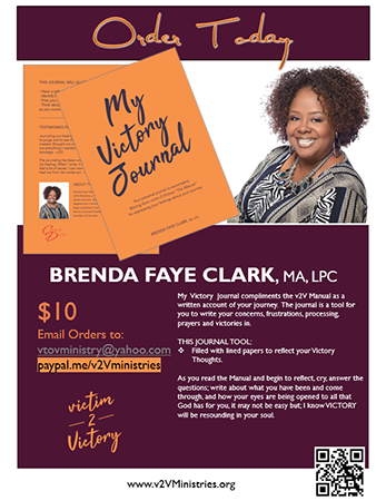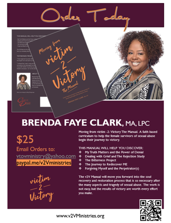 Moving from victim2Victory, “The Manual” is Brenda’s first time in creating a document of this nature. Through her research and studies, she found many resources that when put together, became a comprehensive curriculum to help survivors of sexual abuse begin the journey to healing and change for their lives. Brenda also contributed many articles herself to complete this manual. “The Manual” is good for self help- starting the process of healing; working with a counselor as a guided opportunity to healing, and /or used in a support group setting working with others.